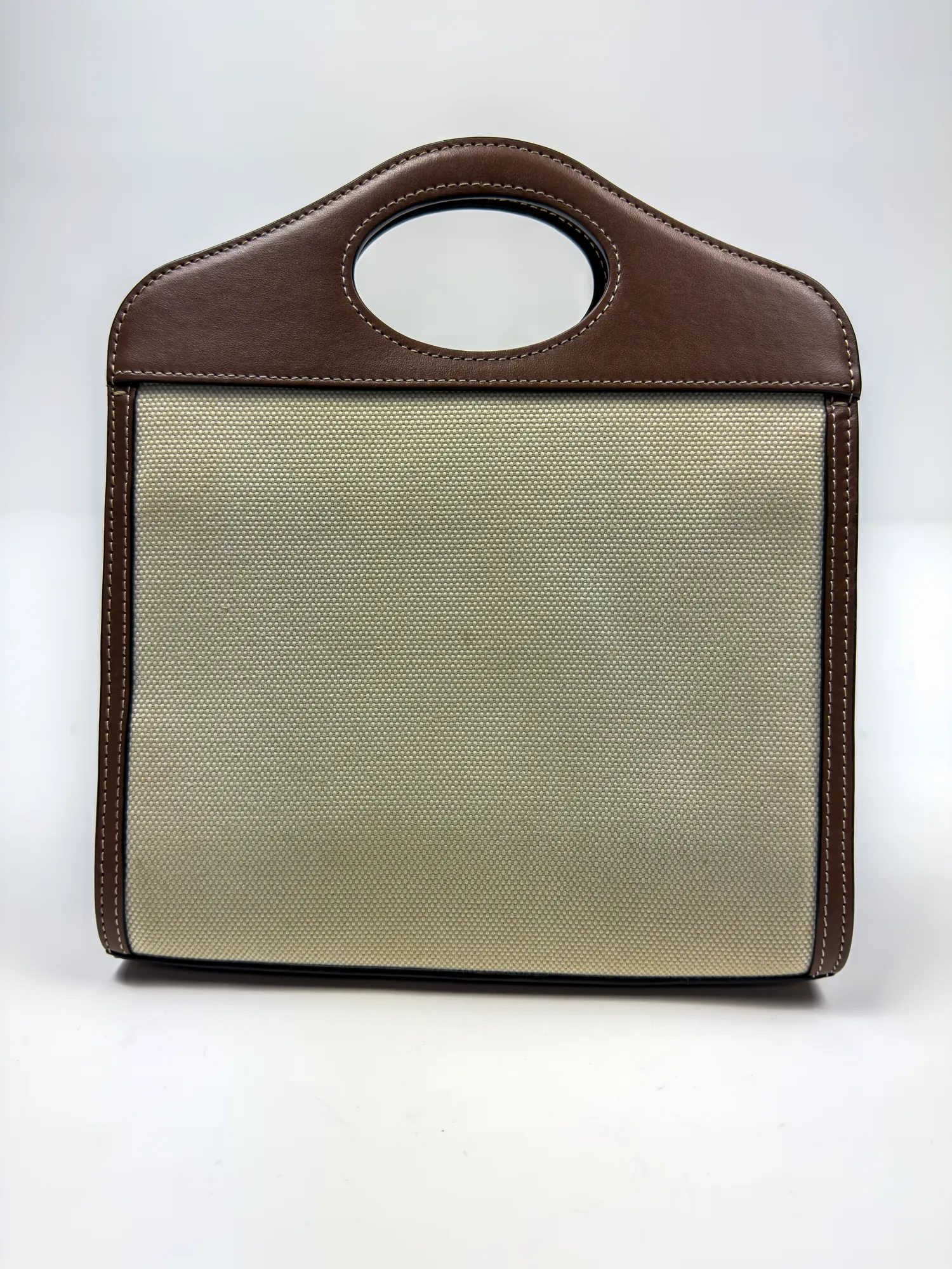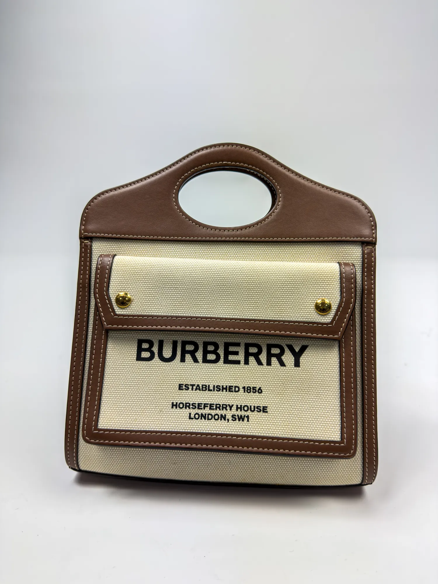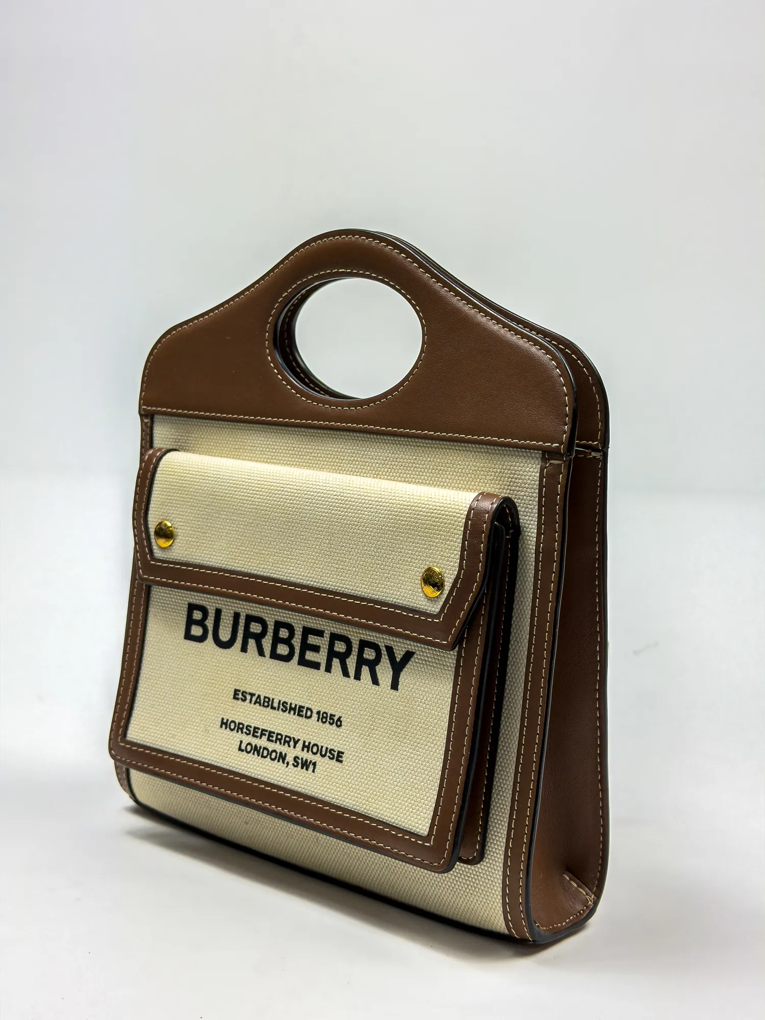 버버리의 버버리 미니 투톤 캔버스 레더 포켓백입니다. 컨디션 등급 A(양호)으로 감정 완료된 정품입니다. 사이즈: 21×12×4 cm • Archived in Monchic Vault (몽시크 아카이브 등재 완료) • 전국 무료 배송