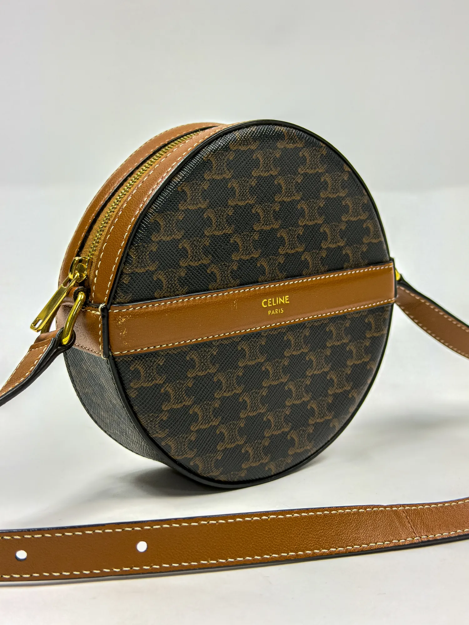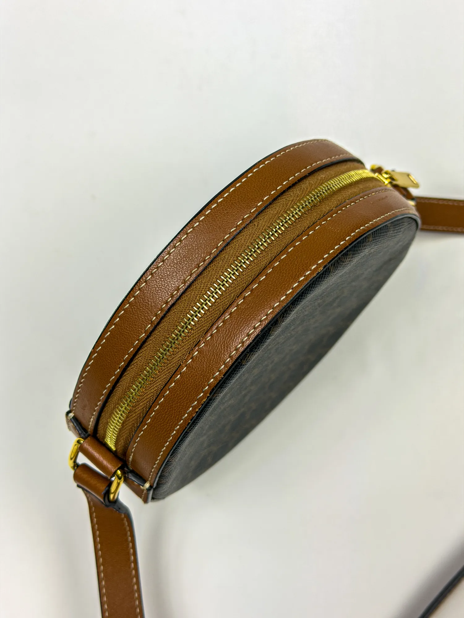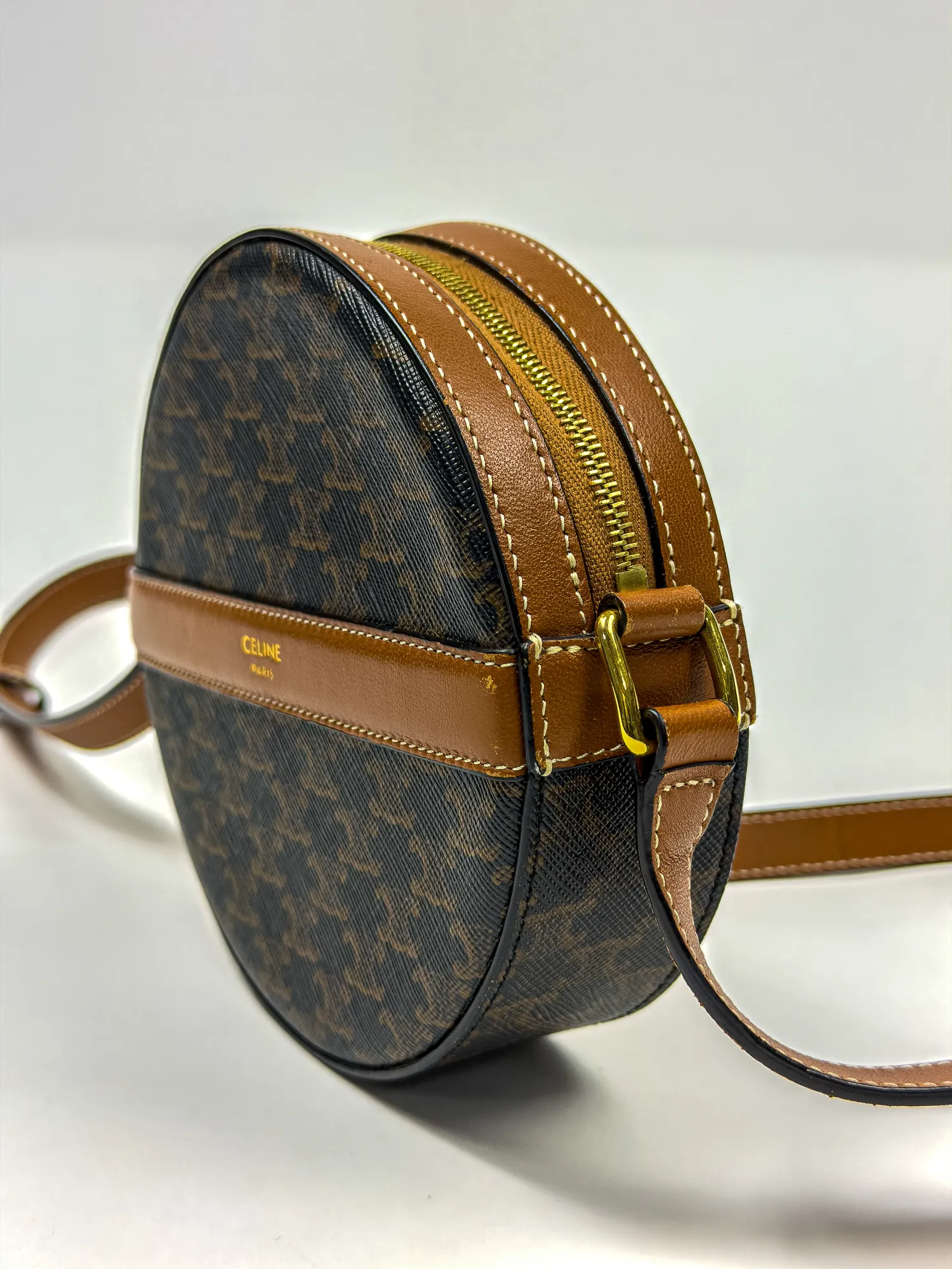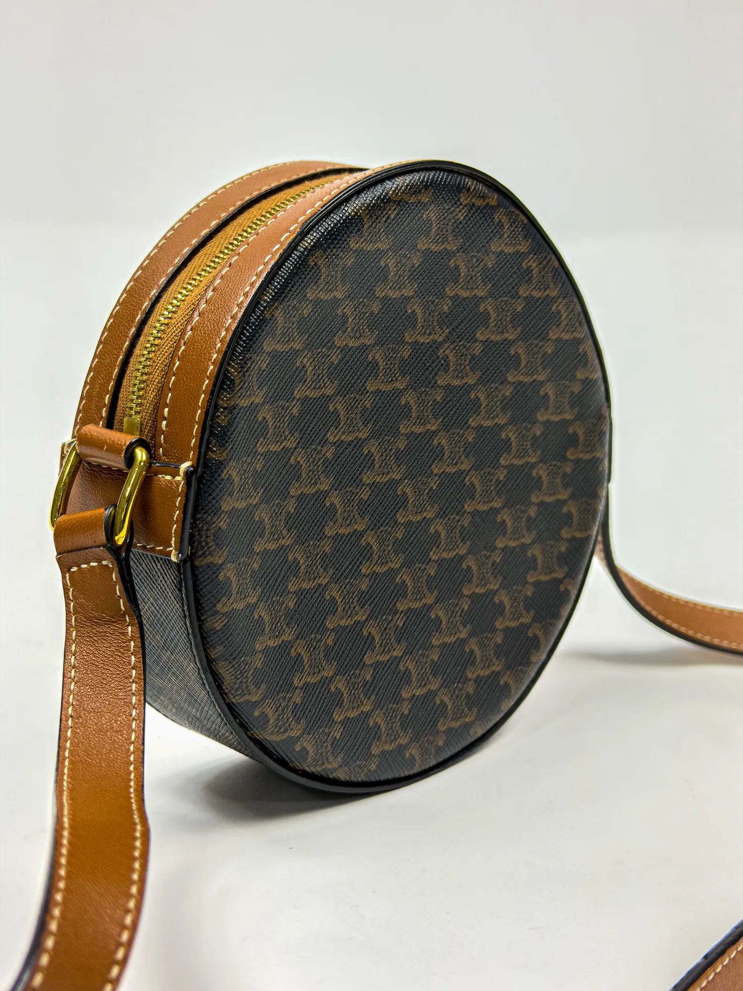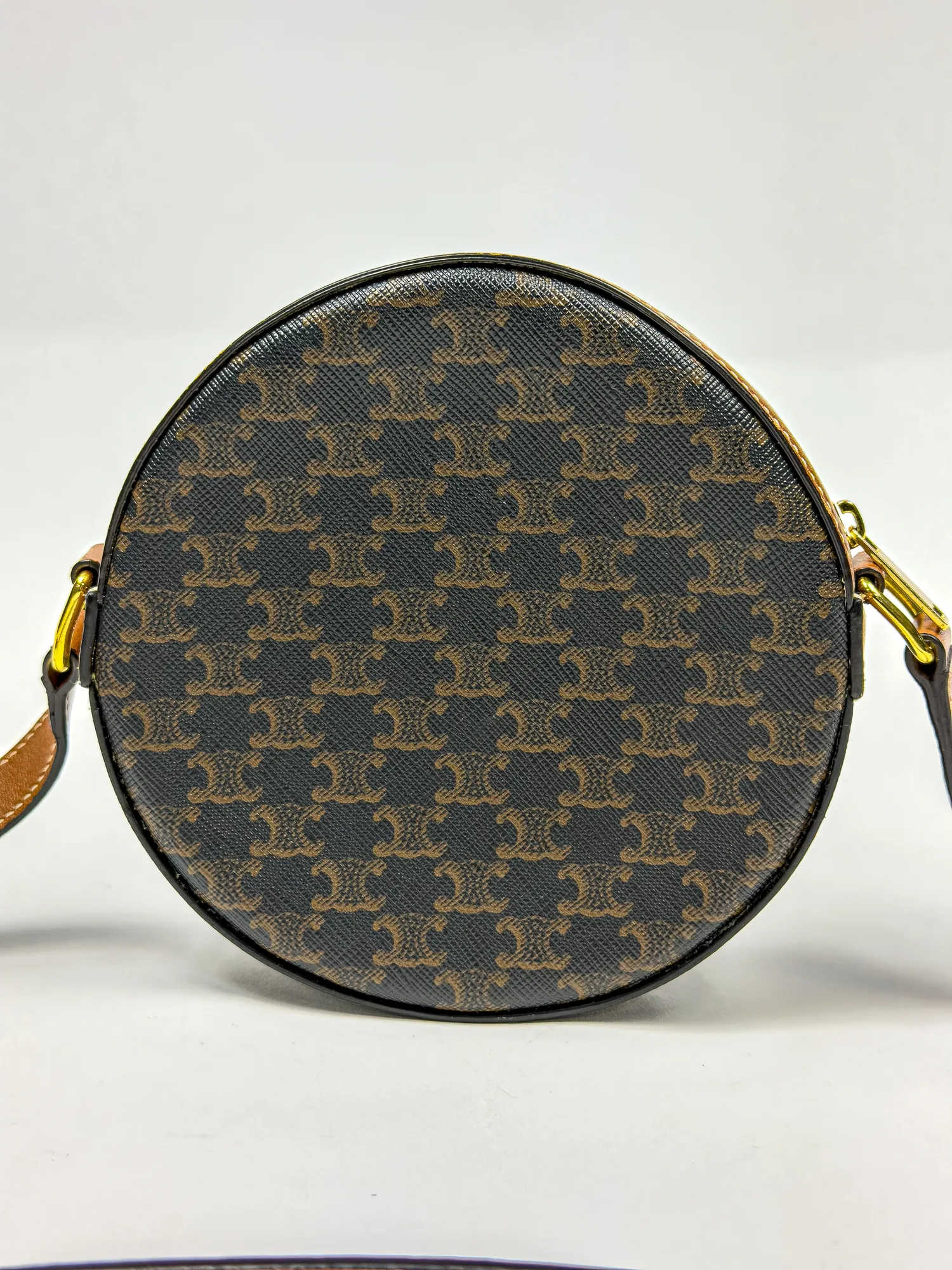 셀린느의 셀린느 스트랩 라운드 퍼스 트리옹프 캔버스 & 램스킨 블랙 탄입니다. 컨디션 등급 A(양호)으로 감정 완료된 정품입니다. 사이즈: 16×16×5 cm • Archived in Monchic Vault (몽시크 아카이브 등재 완료) • 전국 무료 배송