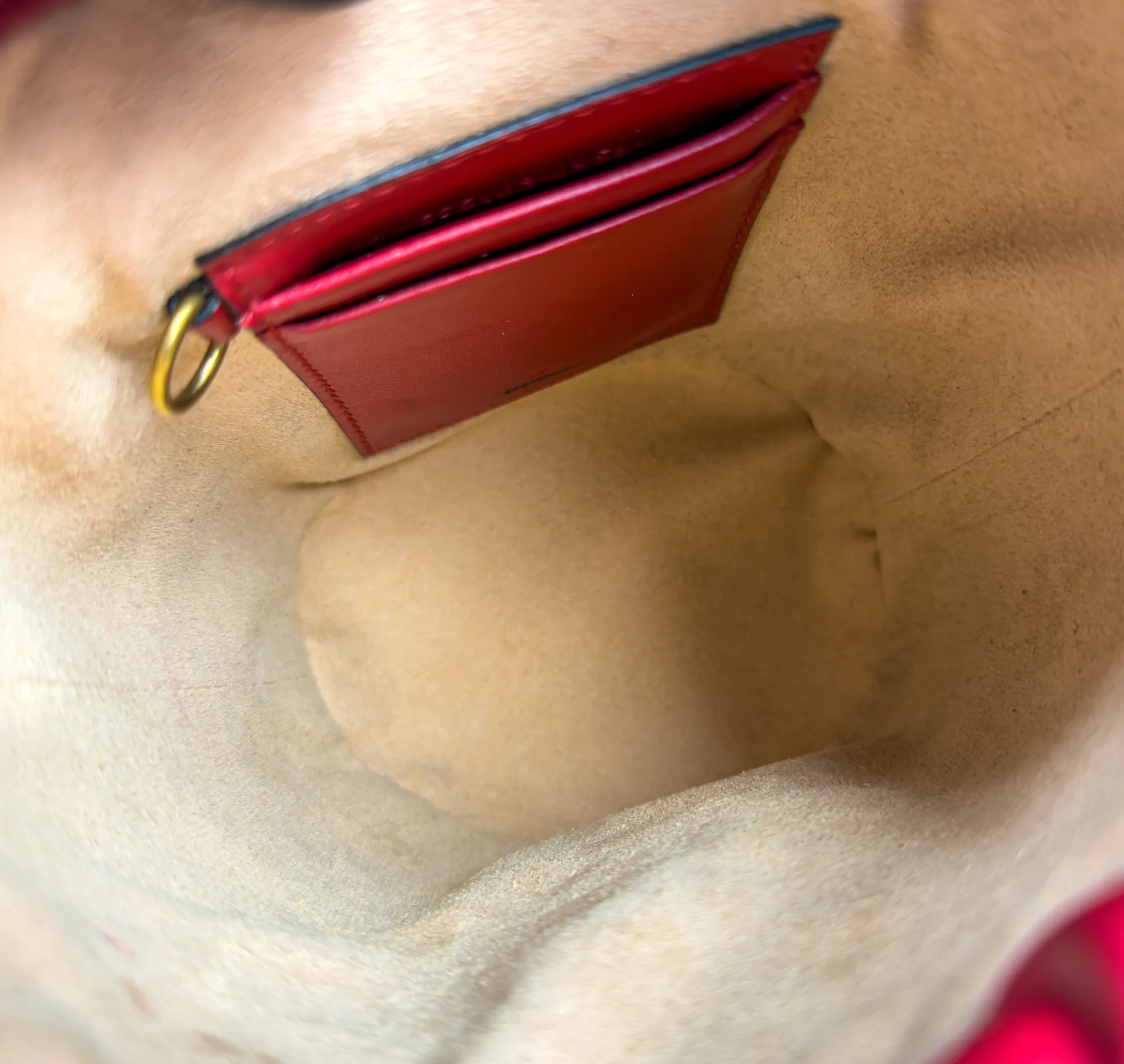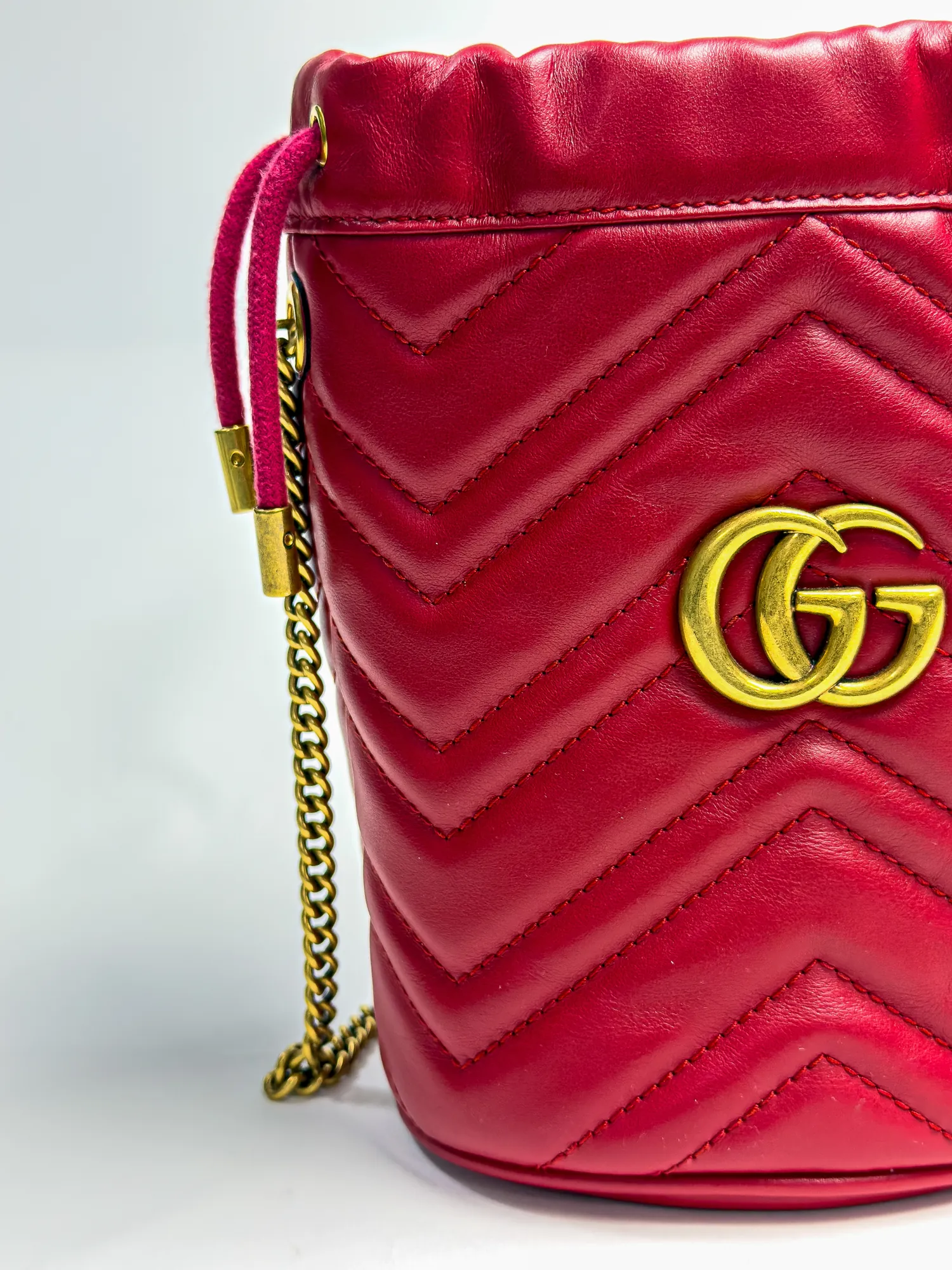 구찌의 구찌 GG 마틀라세 미니 버킷백 레드입니다. 컨디션 등급 A(양호)으로 감정 완료된 정품입니다. 사이즈: 14×18×10 cm • Archived in Monchic Vault (몽시크 아카이브 등재 완료) • 전국 무료 배송