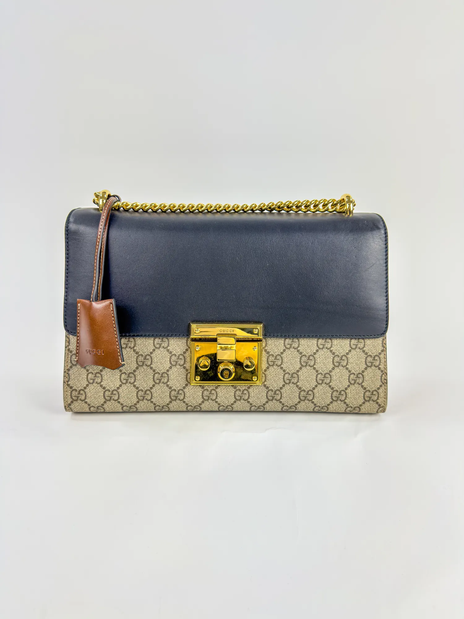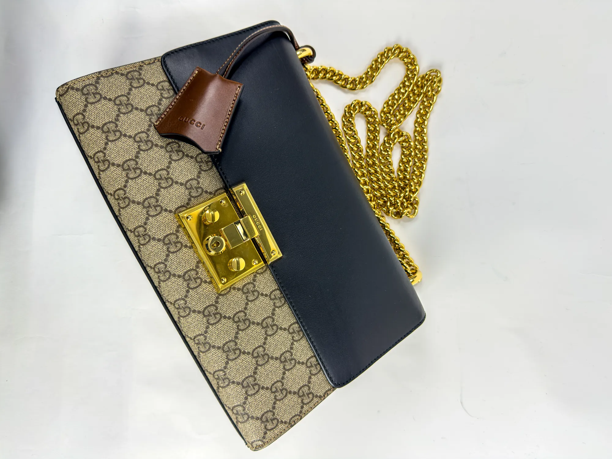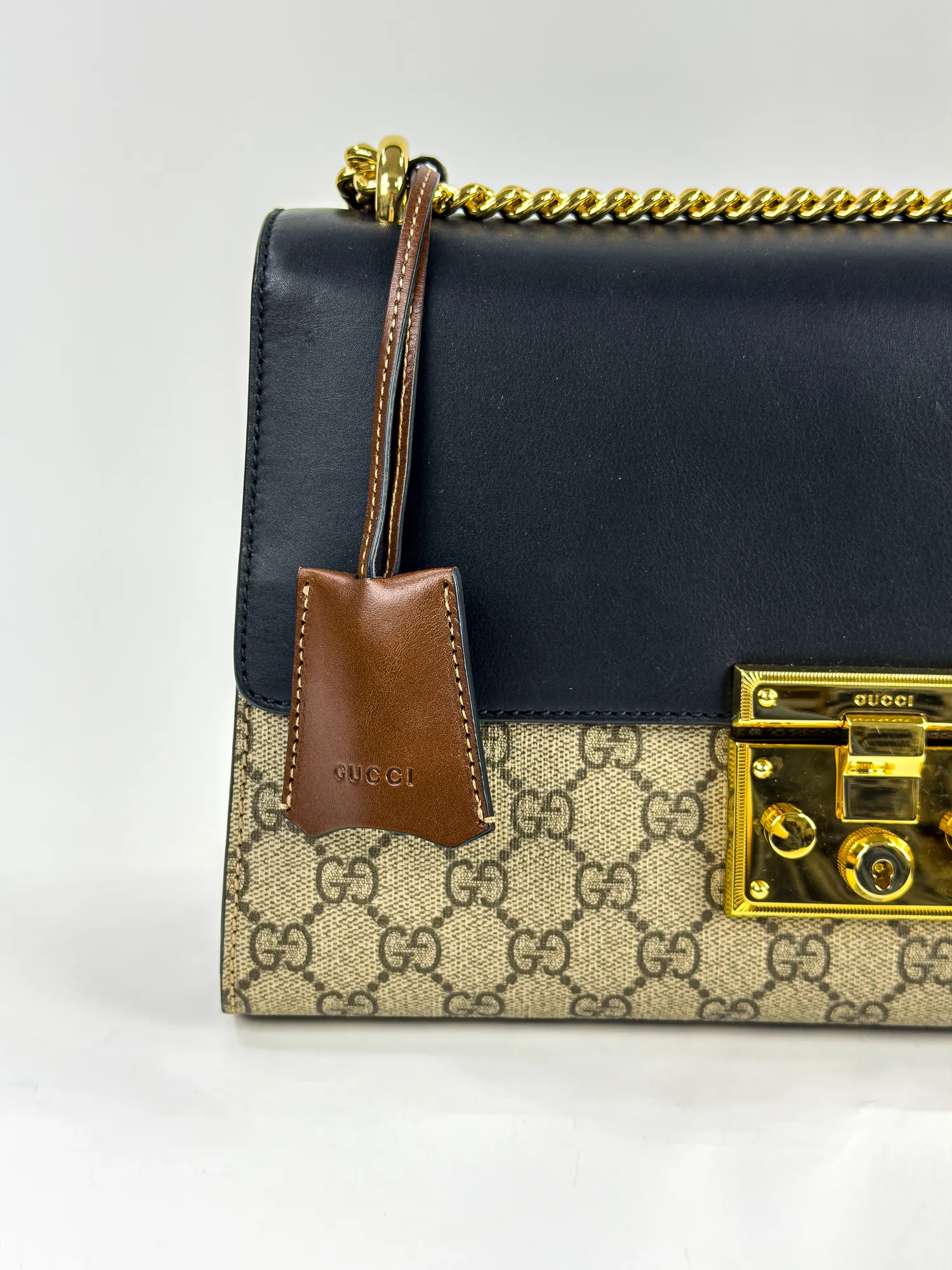 GUCCI 구찌 패들락 미디엄 GG 캔버스 레더 체인 숄더백